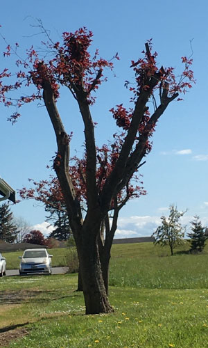 When pruning trees, prune out branches that are dead, damaged, diseased, or deranged. Always prune the branch back to a bud, connection with another branch, or the trunk. Never "top" a tree. This is when the top of the tree is cut at random locations to decrease the tree's height. The cut is where new growth will occur and this can create a "lion tail" effect. It can also weaken and kill a tree. Instead, do directional pruning. |